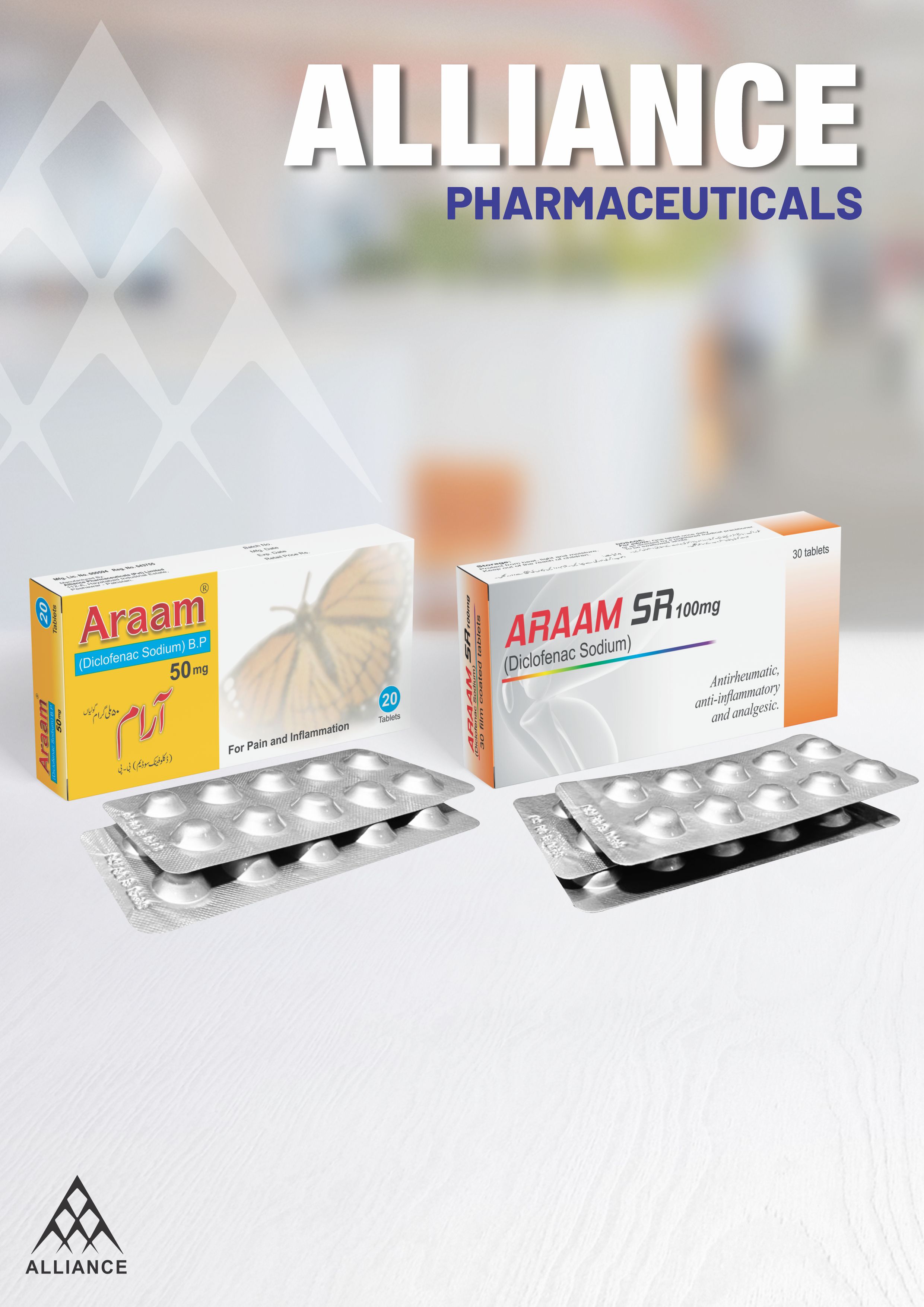 Araam® (Diclofenac Sodium) is used to relieve pain, inflammation, and swelling in conditions such as arthritis, muscle and joint pain, backache, and other acute or chronic painful conditions.