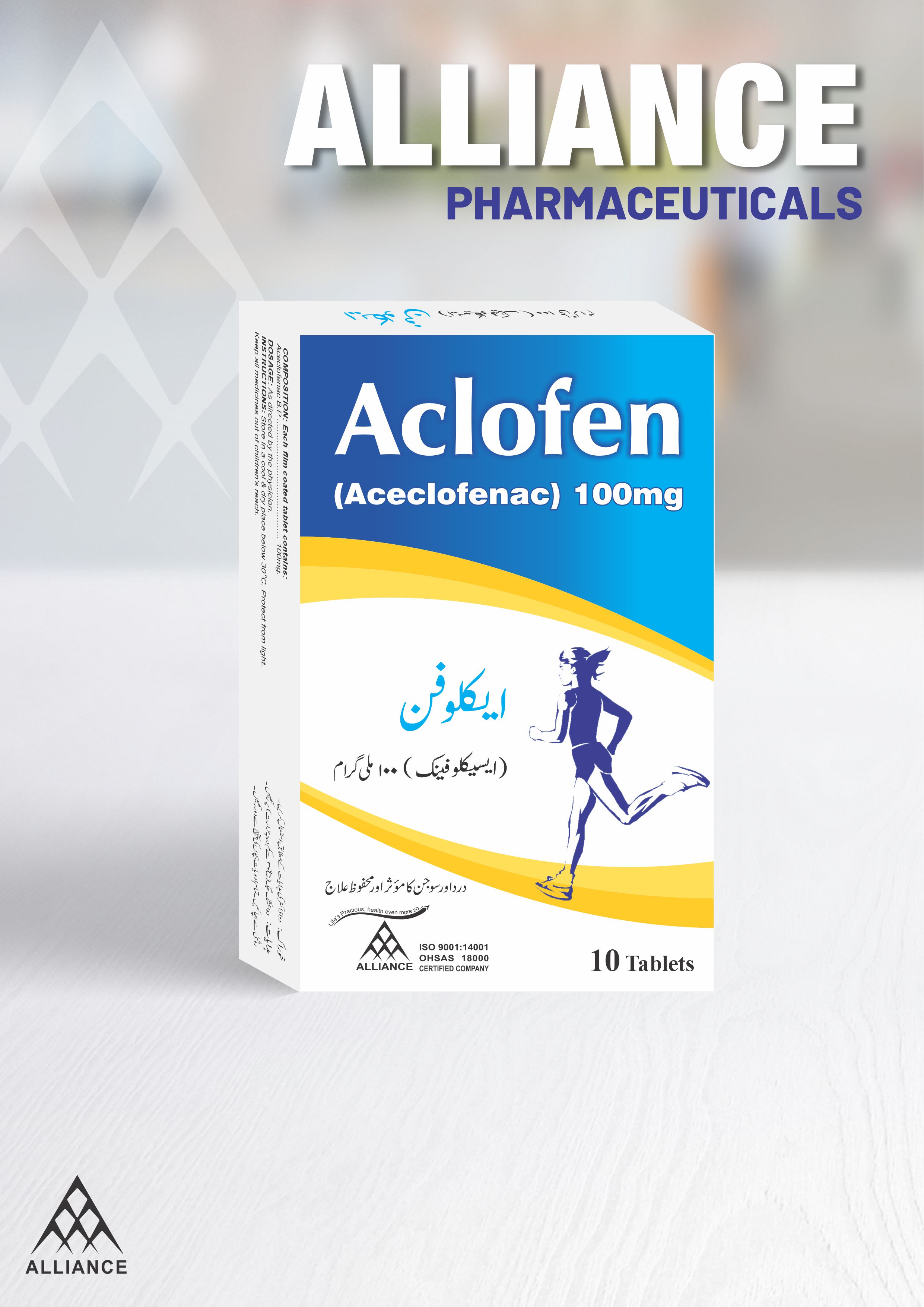 Aclofen® (Aceclofenac 100 mg) is used to relieve pain, inflammation, and swelling in conditions such as arthritis, joint disorders, muscle pain, and other inflammatory conditions.
